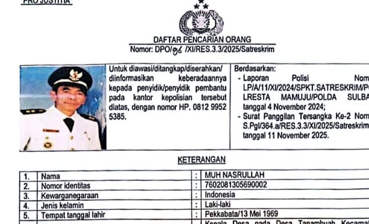 Mamuju, IndigoNews | Polresta Mamuju secara resmi menerbitkan surat Daftar Pencarian Orang (DPO) terhadap Kepala Desa Tanambuah, Kecamatan Sampaga, Kabupaten Mamuju, Sulawesi Barat, Muhammad Nasrull...