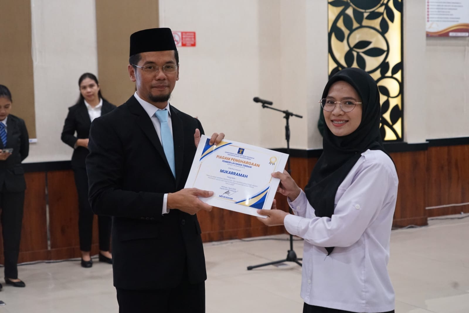 Penyerahan penghargaan tersebut dilaksanakan setelah kegiatan pelantikan pejabat nonmanajerial yang berlangsung di Aula Pengayoman, Rabu (1/4/2026).