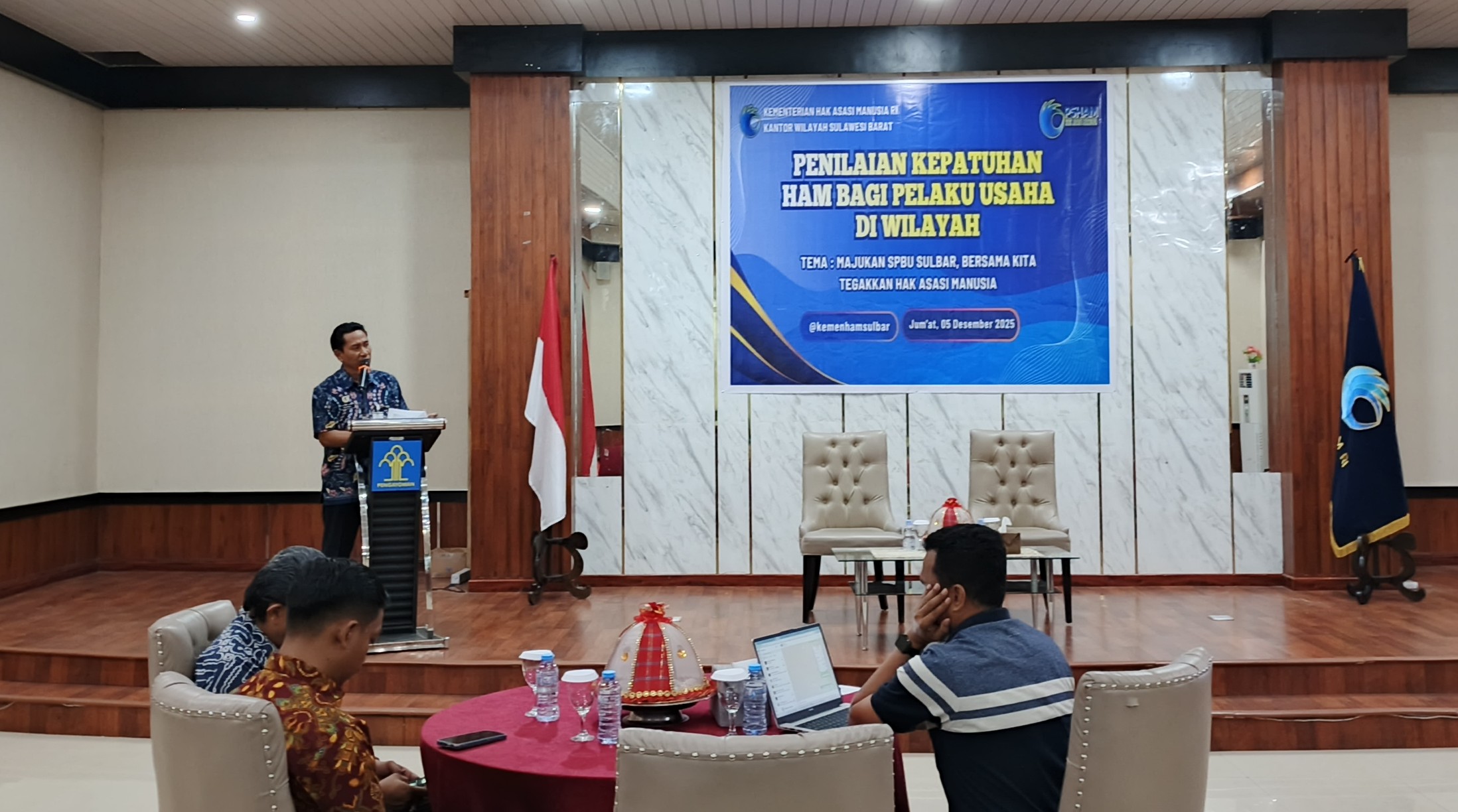 Mamuju, IndigoNews|  Kantor Wilayah Kementerian HAM Sulawesi Barat, menyelenggarakan kegiatan Penilaian Kepatuhan HAM bagi Pelaku Usaha di Wilayah dengan tema “Majukan SPBU Sulbar, Bersama Kita Tegakkan Hak Asasi Manusia”, yang digelar di Aula Kantor KemenHAM pada Jumat (5/12/2025).