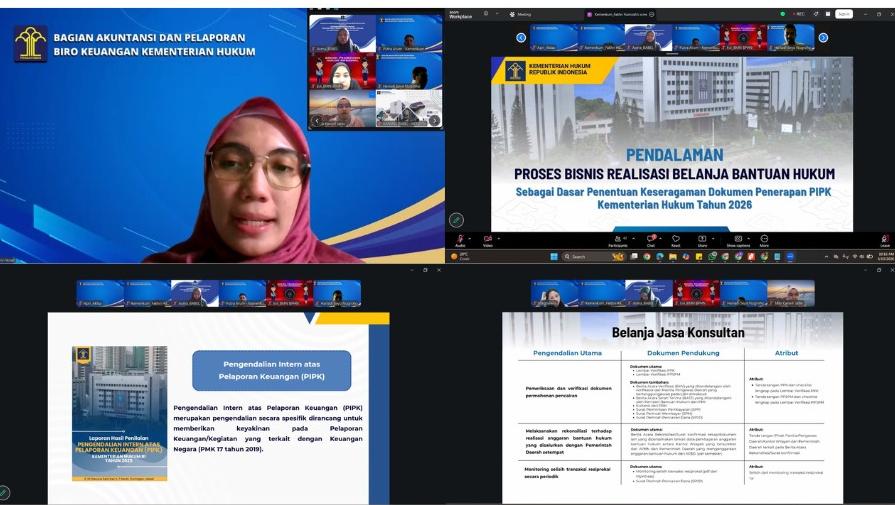 Rapat dibuka oleh Kepala Bagian Akuntansi dan Pelaporan, Eni Fitriah, yang menekankan pentingnya pendalaman proses bisnis belanja bantuan hukum sebagai salah satu akun signifikan dalam penerapan Pengendalian Intern atas Pelaporan Keuangan (PIPK).
