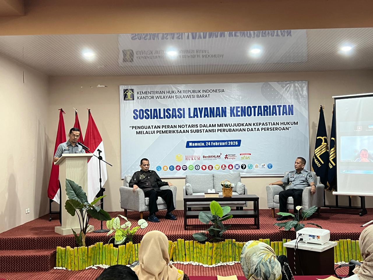 Hal itu disampaikan Kakanwil Saefur saat membuka Sosialisasi Layanan Kenotariatan bertema “Penguatan Peran Notaris dalam Mewujudkan Kepastian Hukum melalui Pemeriksaan Substansi Perubahan Data Perseroan.” Yang dilaksanakan Selasa, (24/2/2026), di Aula Tobadak, Hotel Aflah Mamuju.