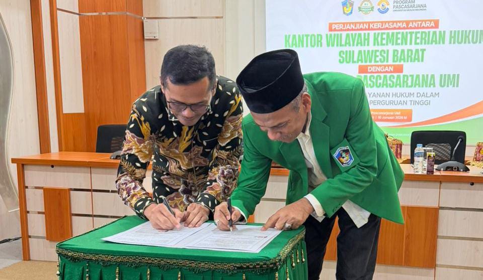 Kerja sama tersebut ditandai dengan penandatanganan Nota Kesepahaman (MoU) antara Kepala Kanwil Kemenkum Sulbar, Saefur Rochim, dan Direktur Program Pascasarjana Universitas Muslim Indonesia, yang dilaksanakan di Makassar, Sabtu, (10/1/2026).